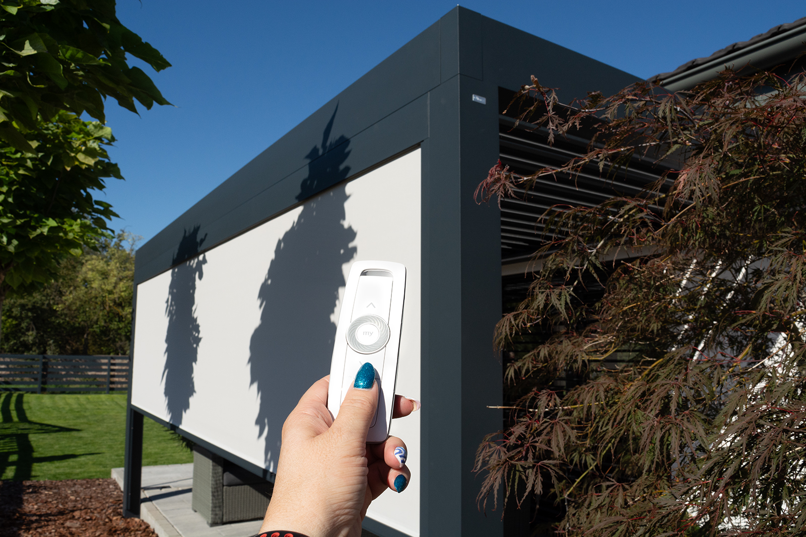 Dálkový ovladač v ruce před pergolou se spuštěnou screenovou clonou